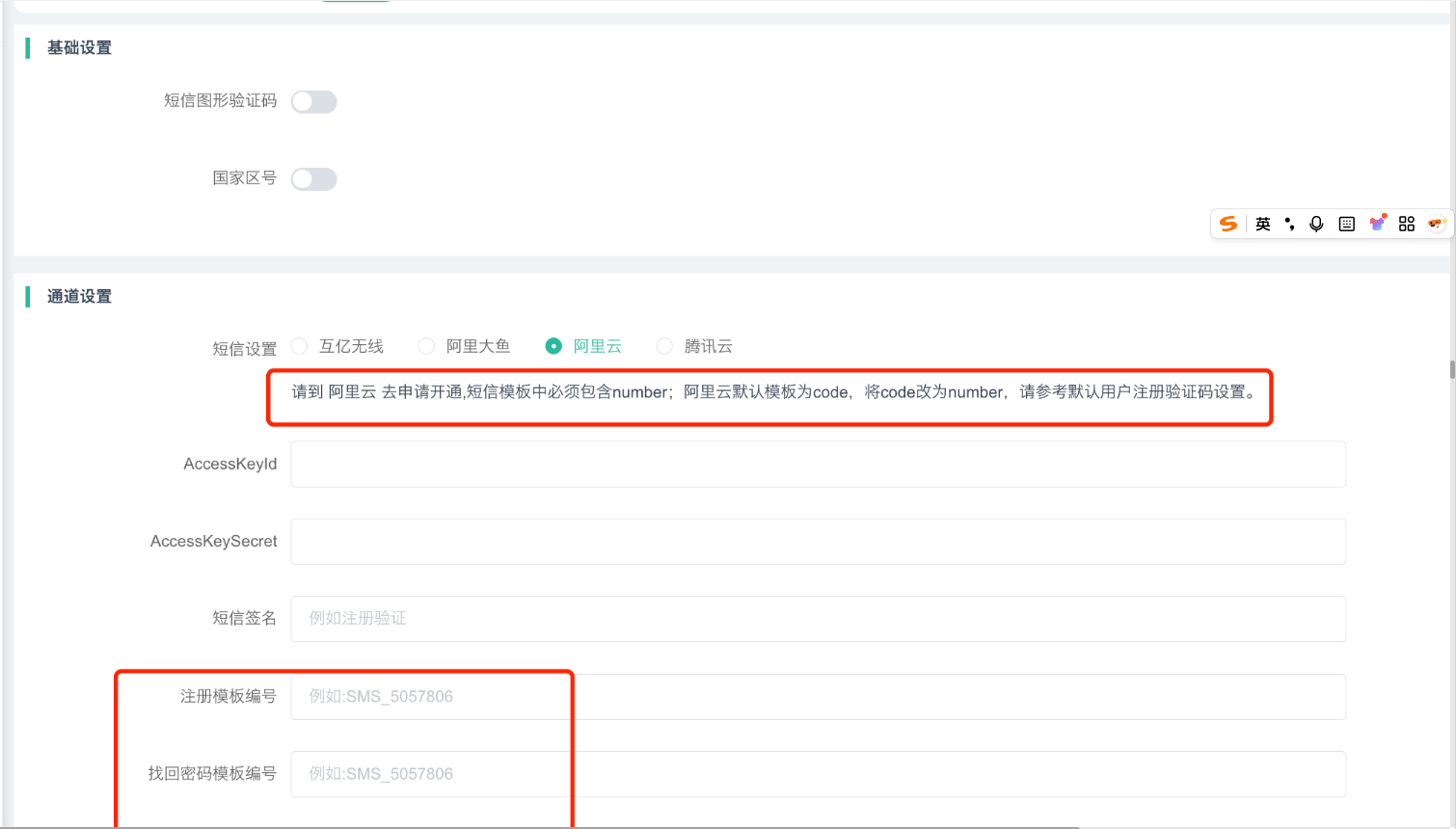 【处理方法】登录阿里云 -- 短信服务 -- 国内消息的模版,请重新申请带有${number}的内容模板,如下图。注意:阿里云的默认值为“number”。申请通过审核后请在后台短信配置重新填写新的。